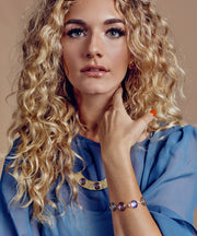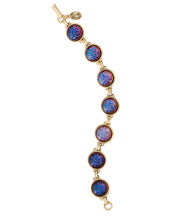 A charming, vintage style bracelet hand set with glass, violet hued glass cabochons and plated in a 14K antiqued gold. Goes perfectly with our Moon Rock Earrings or Crescent Necklace. 7.25" long and .5" wide. Made in the U.S.A.